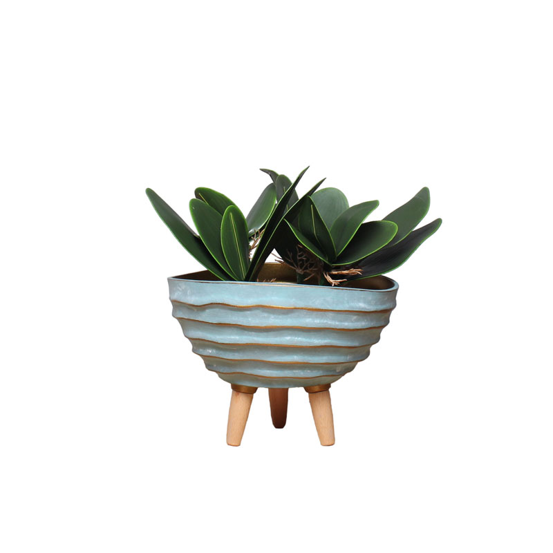 ブルーとゴールドのラインがミックスされたセラミックボウル、木製の脚は100LBS以上でストレステスト済み