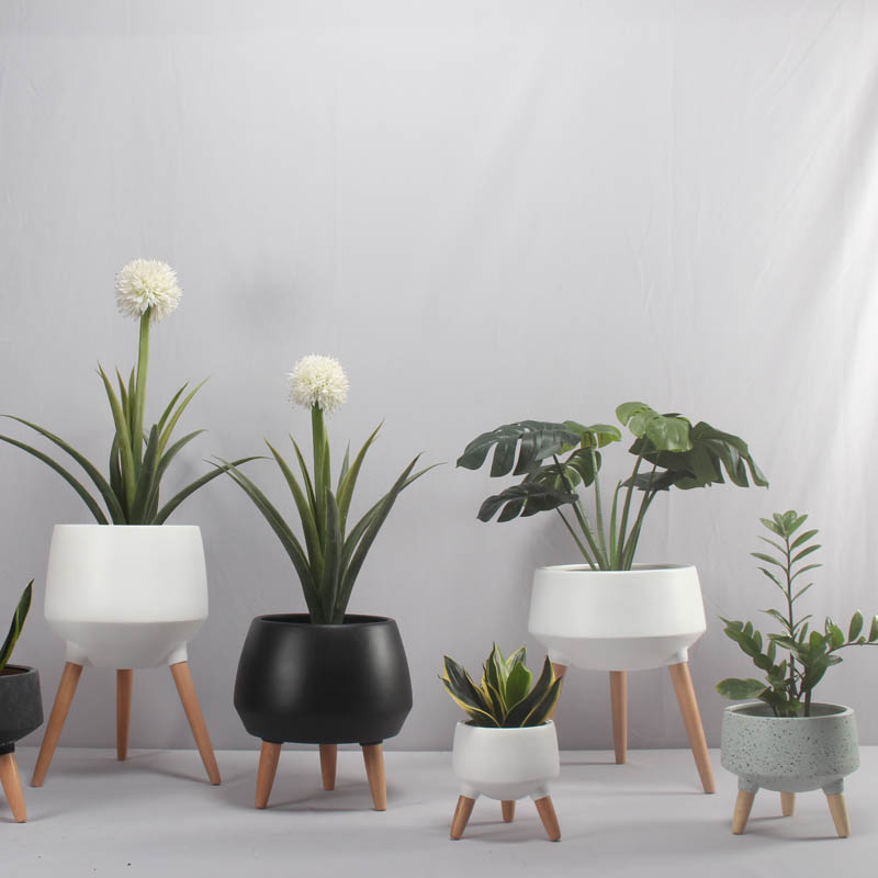 屋内または屋外の木製の脚を備えたセラミックプランターが利用可能です